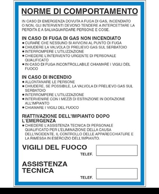 Cartello 'norme di comportamento in caso di gas o incendio'