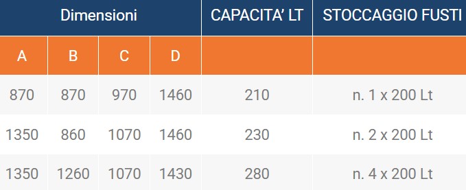 Contenitore accatastabile con vasca di raccolta per 1, 2 e 4 fusti